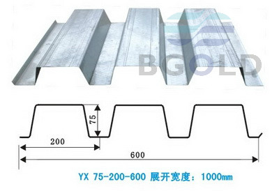 該板型波高75mm,波距200mm,有效覆蓋寬度為600mm,展開寬度1000mm.其既可作為樓承板上面澆注混凝土,亦可作為鋼結構屋頂底面承重板,是國內外常用之板型,也是國家標準GB/T 12755-91建筑用壓型鋼板上之標準板型。