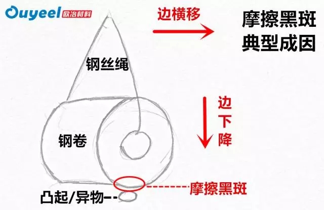 任何同時受到擠壓和晃動的場景,均可能導(dǎo)致摩擦黑斑。如,鋼卷吊運時快速下降并橫移,或在船艙內(nèi)固定不良導(dǎo)致滾動或翻卷等。