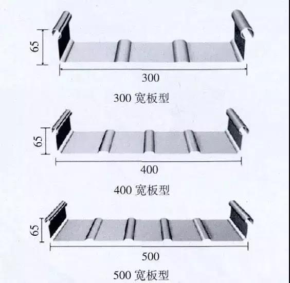 直板板型肋高一般為65 mm,常用的板寬有300mm、400 mm 及500 mm(圖9)。其中板寬300mm 的在屋面荷載較大時使用;400 mm 的為常用、經濟型的;500 mm 的為屋面板本身最經濟的板型,但下部檁條間距小,且需采取適當措施防止板變形。板型詳況,見圖10。