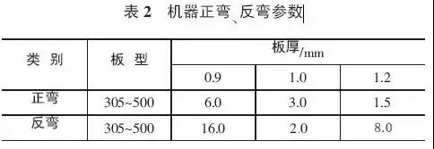 彎弧板機器正彎、反彎參數,見表2。